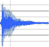 これから何が解るかというと、三味線の音はインパクトが強くいきなり立ち上がっているのが解ります、その直前にある小さな振幅がおそらくバチが糸に触れた瞬間の音です。その後一気に立ち上がって最大音量になり、その後すぐに減衰する、余韻はあまり残らず早く消える傾向にある。