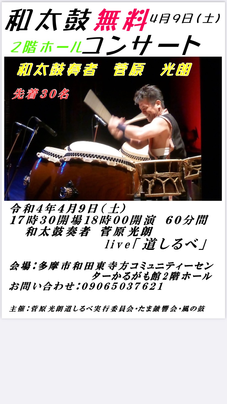 2022年4月9日 澤田勝邦、出演情報 投稿日: 2022年4月3日2025年8月9日 投稿者: katsukuni 和太鼓、菅原光朗氏のコンサートにゲスト出演の予定 地域のコミュニティセンターの無料コンサートなので、楽しく演奏してお客様に楽しんでいただきたいですね。 今回は私の提案で和楽器界では画期的なフリー表現に挑戦しようと思っています。 ジャズにフリージャズ、クラシックに現代音楽・・・・ならば伝統和楽器に現代フリー表現を・・・ 先日リハーサルは無事に済んでいます。 ぶつける様な、破壊的な、打ち壊すところから、コロナの世を再生する力となるイメージを曲に込める・・・・・そんな演奏を、やります!!