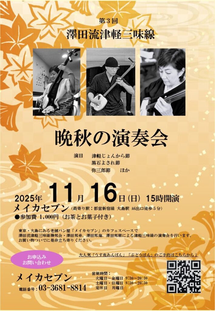東京・大島にある老舗パン屋「メイカセブン」のカフェスペースで澤田流津軽三味線勝紀会・澤田邦希、澤田邦海、澤田邦順による津軽三味線の演奏会を行います。